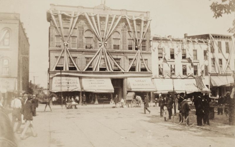 A grand parade was held with members of the Eugene Reynolds GAR Post No. 441, the Eugene Reynolds Women’s Relief Corps No. 156, various lodge members, men and women on horseback floats, and eighty-two business display carriages containing distinguished guests. Downtown buildings were decorated with large streamers and banners.