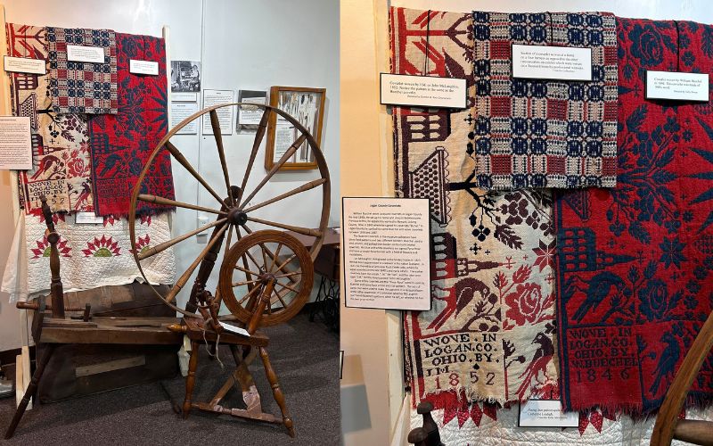Hand‑spun wool was often taken to skilled weavers who crafted it into intricate Jacquard coverlets. From 1844 to 1847, William Buechel produced these coverlets in his Bellefontaine home. Ian and Margaret McLaughlin, who immigrated from Scotland in 1820, first settled in Greene County before moving to a farm near Rush Creek Lake in 1833. Ian, who had apprenticed as a weaver in Scotland, continued producing coverlets into the late 1840s and early 1850s. His early work is marked with the initials “I.M.” for Ian, while later pieces display “J.M.” after he adopted the Americanized name John McLaughlin. The Buechel and McLaughlin coverlets share strong similarities, leading to the belief that McLaughlin may have purchased Buechel’s patterns after Buechel ended his weaving career and left Logan County.