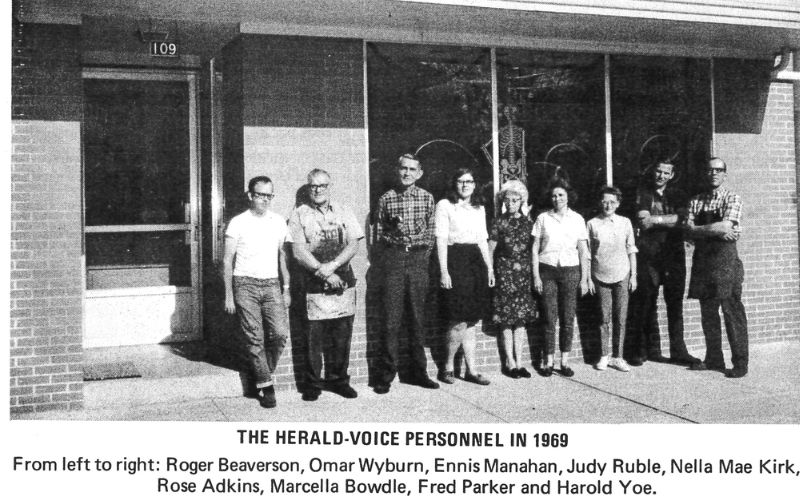 By 1934, the Herald-Voice had outgrown its building and moved to a nearby larger location. The enlarged quarters enabled Manahan to buy a hand-fed Babcock press that printed four pages at a time on one side. He also installed an electric-powered folder, which eliminated folding papers by hand.