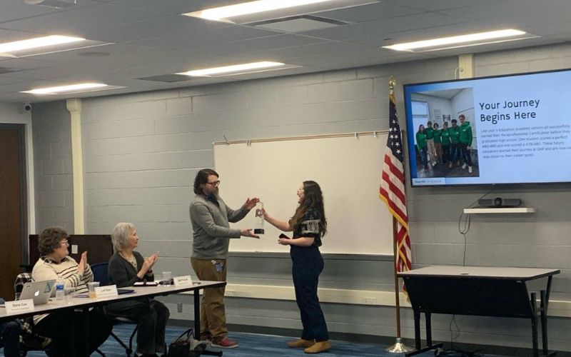 Teacher, Ryan Gilbert, was presented the Milken Educator Award Obelisk by an Ohio Department of Education Representative.
