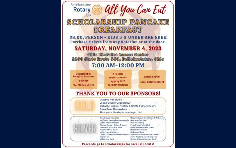 The Bellefontaine Rotary Club will host a scholarship pancake breakfast from 7 a.m. to noon Saturday at the Ohio Hi-Point Career Center.