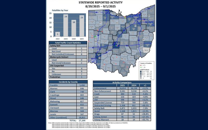 The Ohio State Highway Patrol (OSHP) reports 23 deaths in 20 fatal crashes over the four-day Labor Day weekend reporting period, which began Friday, at midnight and concluded Monday at 11:59 p.m.