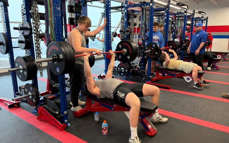 The weight room is a cornerstone of Riverside’s broader athletic facility overhaul. Designed to replace a cramped, outdated space that limited training capacity, the new room boasts an expansive layout filled with pristine benches, power racks, and a dedicated area for aerobic and plyometric exercises.