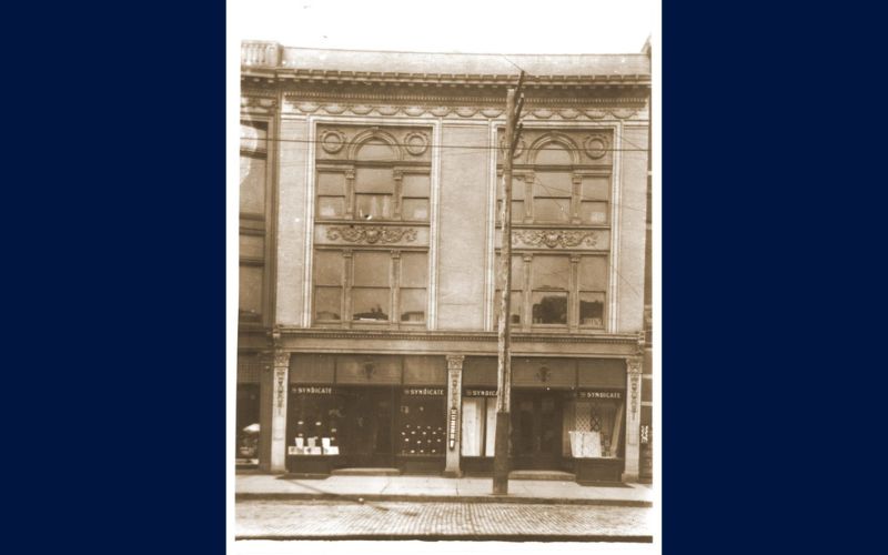The entire block is known as the Kauffman Block, built by Max Kauffman in 1907. He operated the Syndicate Department Store at this location through 1918. Kennedy Brothers furniture replaced the Syndicate until it was sold and became Armstrong & Allen Furniture in 1927. Armstrong & Allen was in business for many years until 1990. In 1992, Canterbury Coffee opened for two decades.