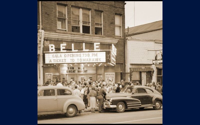 The building was erected in 1884 and converted into a movie theater in 1916 named The Strand. Sound equipment was installed in 1929 so that “talkies” could be shown. New equipment and air conditioning were added in 1950 and the name was changed to the Belle Theater. After the Belle closed, the building was occupied as a Sears Roebuck Store for many years. Most recently, the building was home to James Flooring for more than 20 years.