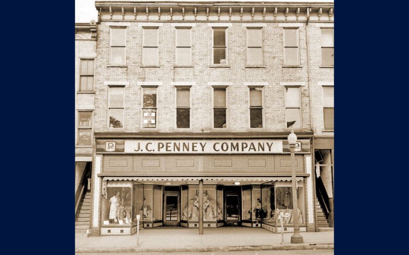 Built after the fire of 1856, Churchill Hardware Co. operated at this location for over 70 years. The front of the building was remodeled in 1909. The J.C. Penney Co. occupied the building from 1927 to 1959 when it moved to the Zerbee Building at 118 S. Main and remained for more than 25 years. J.C. Penney himself attended the grand opening of the new location.