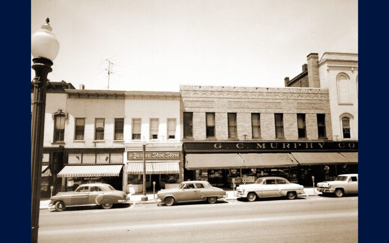 130 S. Main, built in 1875, is the center section of what is known as the Buckeye Block. G.C. Murphy Co. was the most prominent tenant, occupying from 1917 to 1982. In 1956, the owners doubled the buildings’ size to better accommodate the population of the city and a growing number of customers. Many customers recall fond memories of the deli counter, soda fountain, and the aroma of hot roasted nuts permeating throughout the area.