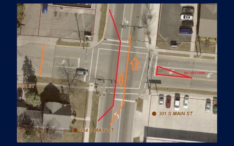 There will be no left turn permitted from East Water Street onto South Main Street, and West Water Street will be closed at the intersection.