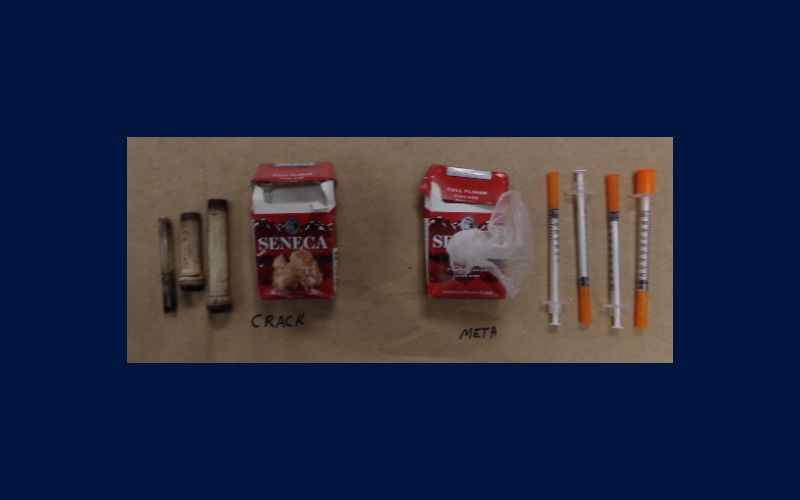 A search of the truck turned up crack cocaine, methamphetamine, and drug paraphernalia, including used syringes and pipes with drug residue.