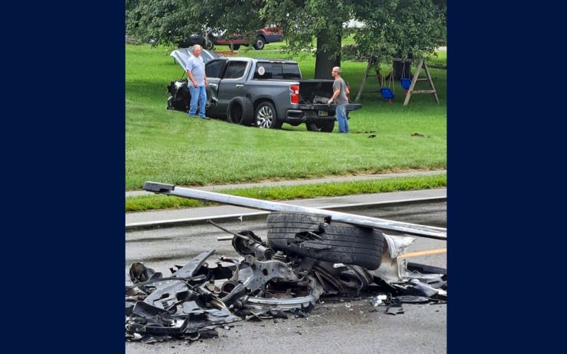 The two vehicles, a pick-up and a sedan, hit head-on at the intersection, leaving debris scattered across the roadway.