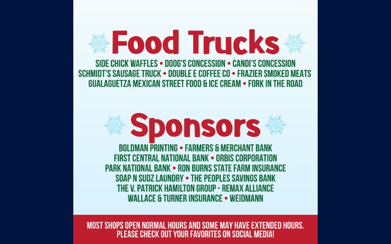 Local shops and stores will be decorated and open, full of the holiday spirit at 10 am. Food vendors will begin offering services at 4 and holiday music will fill the streets beginning at 4:30.