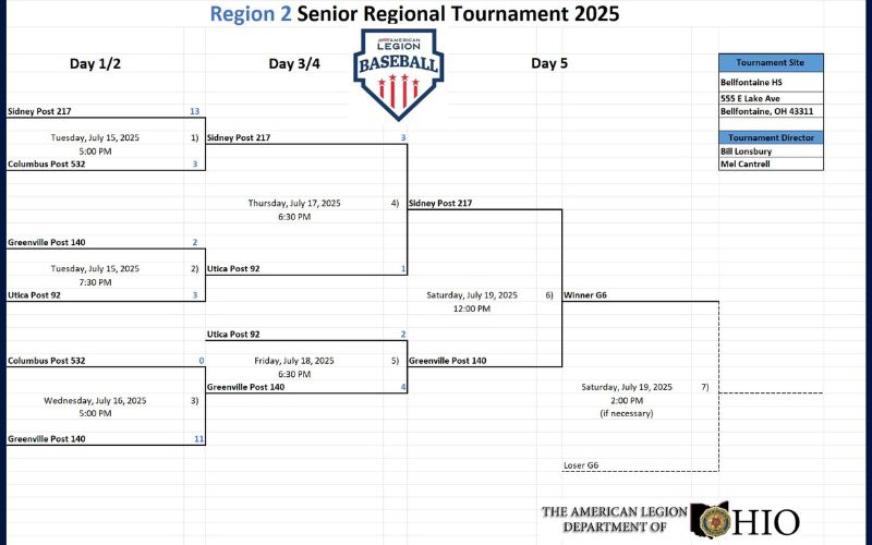 The American Legion Baseball Region 2 tournament filled Blue Jacket Park this week and is now down to its finals on Saturday, beginning at noon. It’s Sidney Post 217 battling Greenville Post 140 to see who will represent Region 2 in the state tournament. Celebrating 100 years of American Legion Baseball, the tournament is scheduled for July 25-28, at Beavers Field in Lancaster.