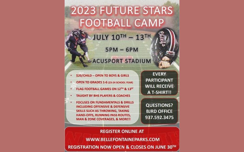 The 2023 Future Stars Football Camp will be held on July 10th-13th at AcuSport Stadium at Bellefontaine High School. The camp runs each day from 5-6 p.m.