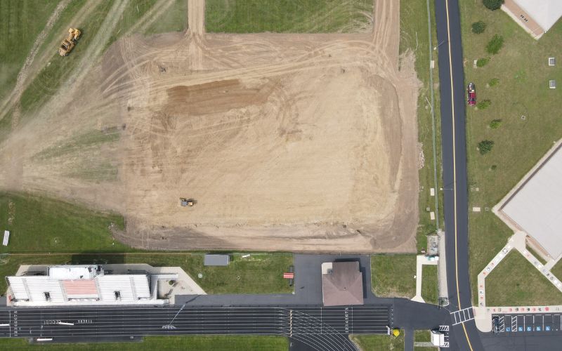 Drone footage captured by Link on Wednesday shows early progress at the site, including topsoil removal and initial building pad preparation.